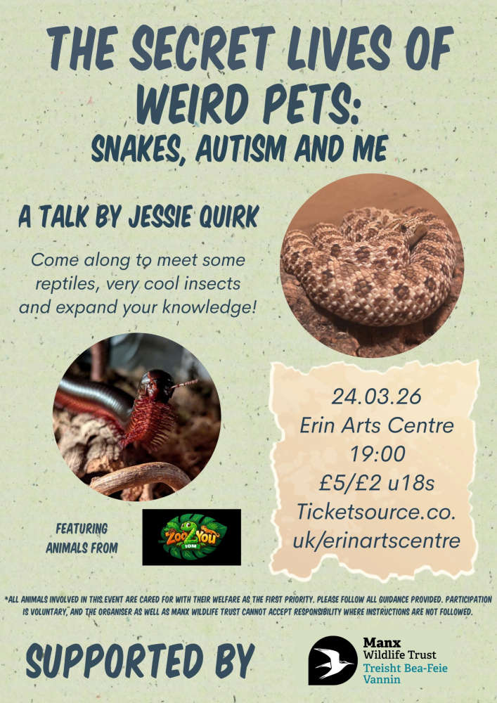 ‘The Secret Lives of Weird Pets: Snakes, Autism & Me’, will take place at 7pm on Tuesday, March 24 at Erin Arts Centre in Port Erin.