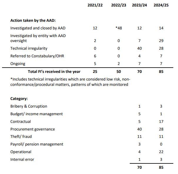 A breakdown of the types of financial irregularities reported shows the majority across the past two years relate to procurement governance.